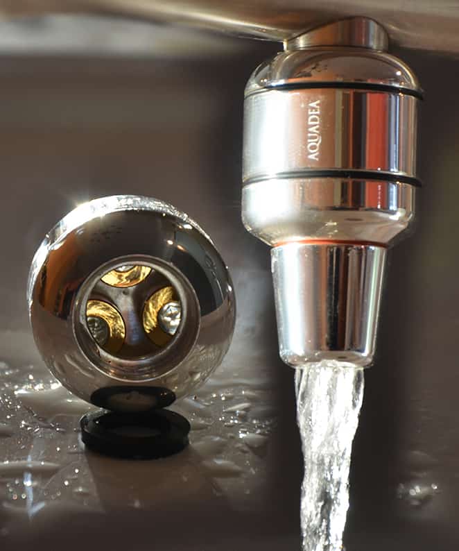 Der Trinity aus Silber mit Goldwirbelkammern und den Kristallen Bergkristall/Rosenquarz/Aquamarin. Ein wundervolles harmonische Wasser wie aus einer Heilquelle.